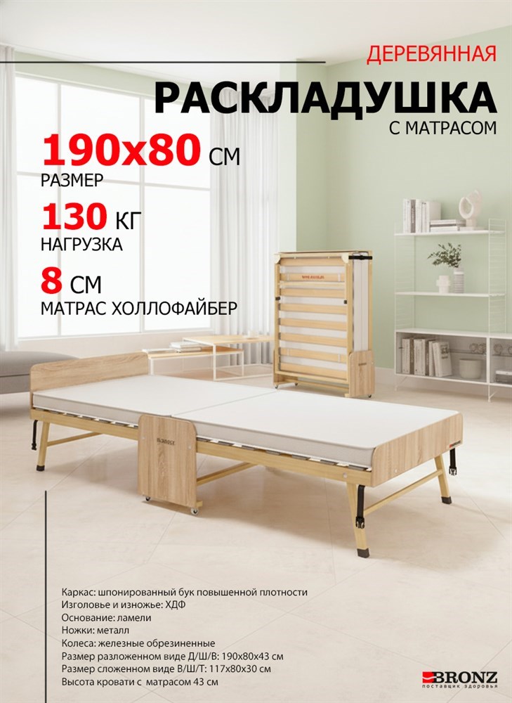 Инновационная деревянная раскладушка с ортопедической решеткой на буковом каркасе и комфортным матрасом из холлофайбера.